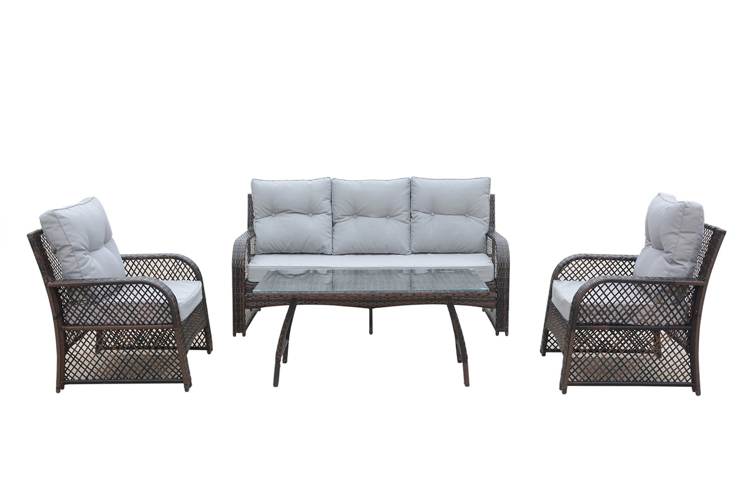 Внешний вид готового изделия: набор состоит из 4 элементов мебели, но каждая из них состоит из стального каркаса, оплетенного искусственным ротангом. Переплетение оплетки достаточно редкое (видны просветы), но при этом оно прочно сохраняет свою форму, и не портиться от жары, влаги, или палящего солнца. Сверху столика уложено закаленное стекло, которое выдерживает до 25 кг.