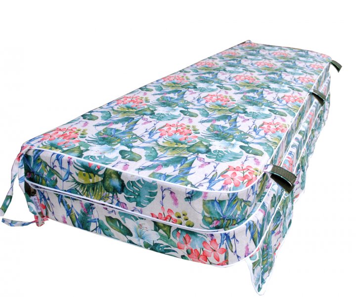 Данный матрас предназначен для садовой качели. Такие матрасы изготавливаются из универсальных тканей, изготовленных в Испании. Благодаря тому, что в такой ткани огромный процент натуральных волокон, она замечательно пропускает воздух, а также является максимально приятной на ощупь. Эта ткань устойчива к появлению пятен, она с лёгкостью разглаживается. Наполнитель изготовлен из пенополиуретана вторичного вспенивания. Спинка, а также сиденье матраса выполнены на молнии, поэтому наполнитель с лёгкостью можно вынуть, а чехол легко можно постирать. Для того, чтобы матрас надёжно держался на качели, на нём есть специальные завязки по бокам.